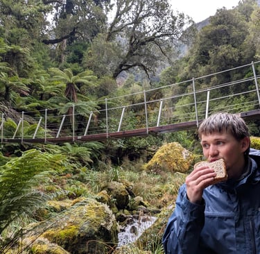 The track along side the river does get technical with a lot of slippery rock hopping, which keeps things fun and interesting. We headed back into the forest and stopped for lunch under the McPhee Creek swing bridge.