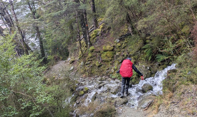 The Track The track was more glorious than we imagined, The first few kilometers are ascending into the tree line but soon enough you head back down where you're met with the valley floor. If you're doing the full circuit this is where you may veer off over the bridge, we skipped past the bridge and over our first stream crossing.